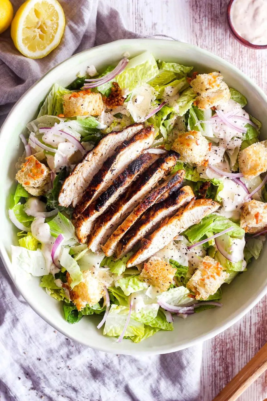 Crunchy romaine lettuce, parmesan cheese, and tender chicken, all in one refreshing salad.